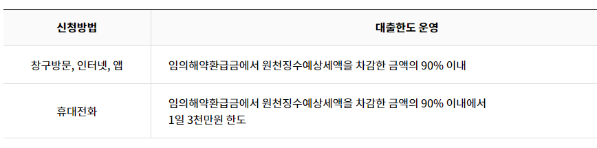 대출금은 계약자 납부부금 합계액을 초과할 수 없으며 10만원 단위로 지급 신청방법, 대출한도 운영으로 구성된 표입니다. 신청방법, 대출한도 운영, 로 구성된 표입니다. 신청방법 대출한도 운